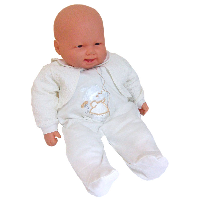 Комбинезон с длинным рукавом на манжетиках, с закрытыми ножками, с отложным воротничком, сзади по все длине и между ножек на кнопочках. Комбинезон украшен спереди аппликацией. Рукава и вшитая спереди накидка-болеро выполнены из материала жатка.