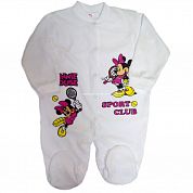 Комбинезон из велюра белого цвета без воротничка, с закрытыми ножками, с длинными рукавами на манжете, спереди и между ножек на кнопочках. Комбинезон спереди украшен рисунками мультгероев.