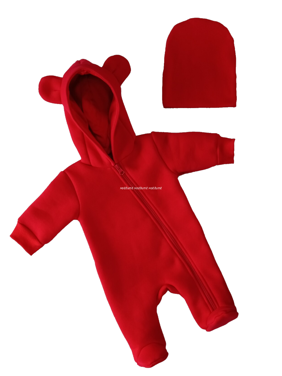"МоёДитё" комбинезон выполнен из футера с начёсом. Комбинезон с капюшоном на подкладке и декорирован сверху ушками, с закрытыми ножками, рукава на манжетах, спереди косая молния до конца одной ножки. Шапочка из кашкорсе можно одевать как с отворотом, так и без. Очень хорошо тянется.